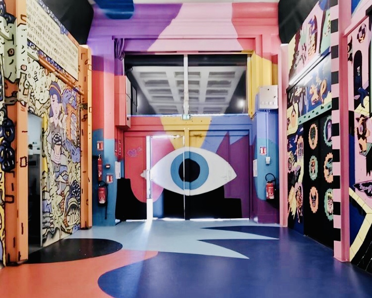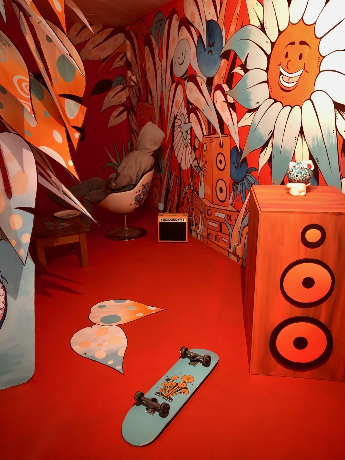 Lampes, machines à écrire, trottinettes, skates, mobilier, vinyles, vases, … Tout un bric-à-brac d’objets peuple la galerie et s’intègre dans les œuvres éphémères qui la magnifient. La famille a d’ailleurs personnellement voulu prendre part à la démarche en donnant cette année un vieux bodyboard qui avait fait son temps! Et on a eu le plaisir de voir la planche intégrée dans une création en tout début de parcours, dans l’ambiance piscine municipale! Et on la récupèrera customisée, désormais unique, à la fin du festival. Pour en faire une future déco de chambre d’ado… Sympa, non?