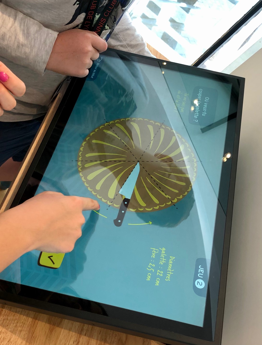 Les enfants apprécient évidemment d’être actifs et impliqués, de se trouver au cœur de l’expo. Et en plus, quand on peut aussi manier une tablette tactile, on peut faire passer toutes les opérations mathématiques ou réflexions géométriques et algorithmiques sur fond de cuisine, avec la galette des rois comme support !