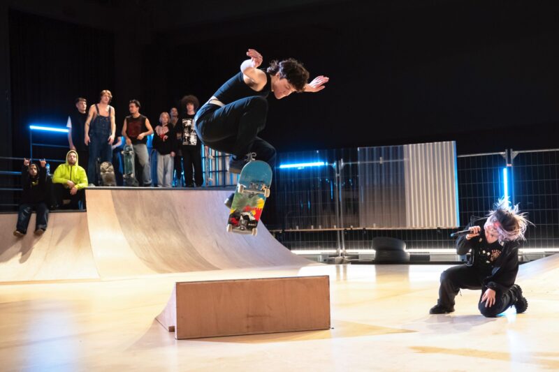 Espace partagé pour une chorégraphie hors norme dans un lieu mythique, voilà tout le pari de Skatepark. C’est la chorégraphe et skateuse danoise Mette Ingvartsen qui nous propose un spectacle à l’énergie communicative et au rythme continu. On découvre la vie d’un groupe qui évolue dans un décor de skatepark créé spécialement pour cette pièce.