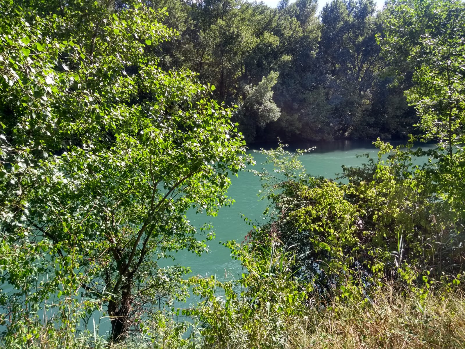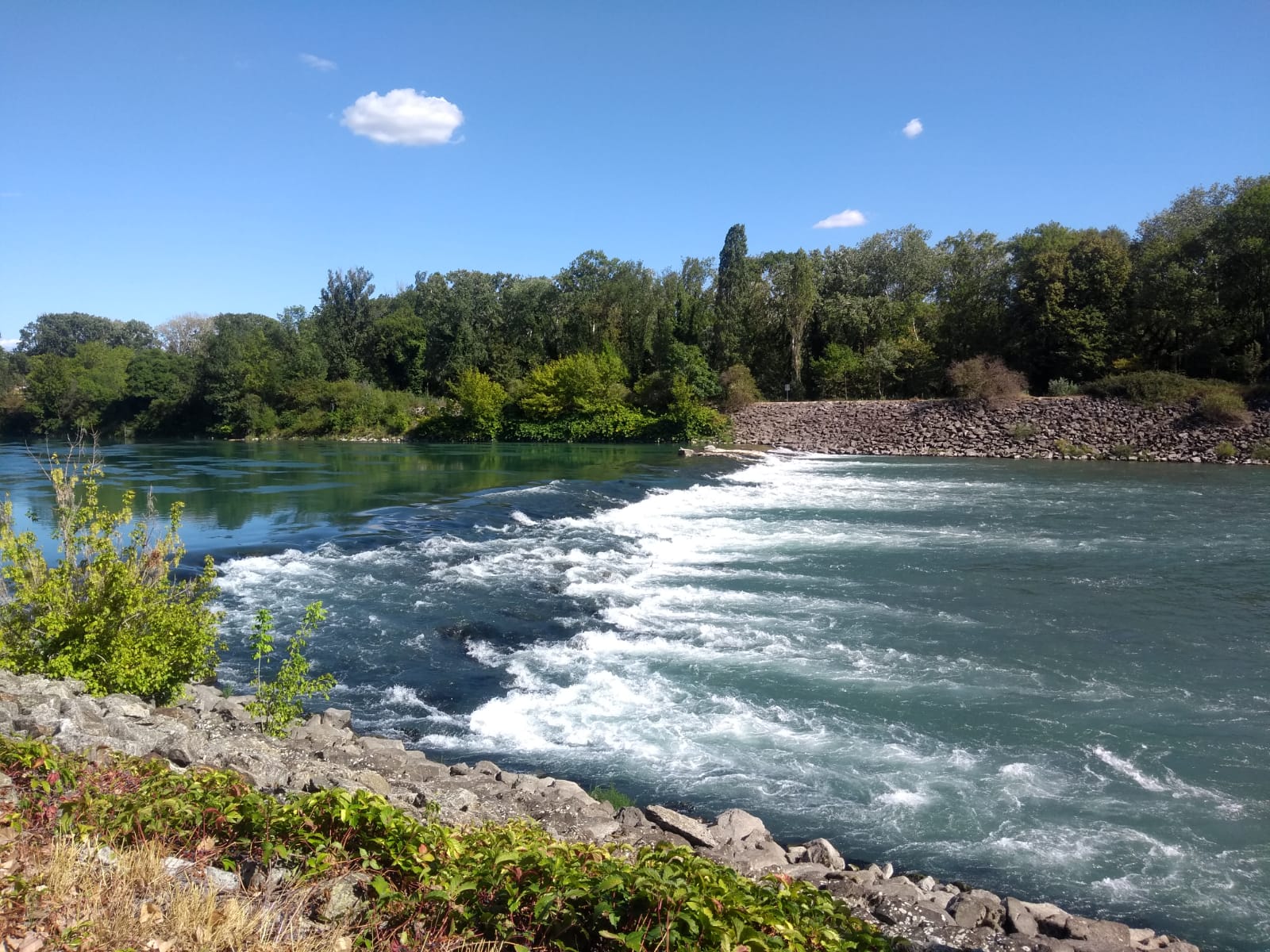 On passe alors sous la passerelle et on emprunte les berges du Rhône, côté rive droite dans le Parc de Saint Clair.