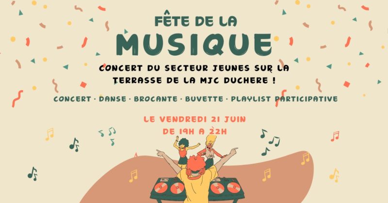 On investit la terrasse de la MJC Duchère pour profiter d’une soirée haute en musique ! Concert du secteur jeune, atelier de danse K-Pop, playlist participative, la MJC monte le son et propose une soirée conviviale et familiale où les jeunes seront à l’honneur. Et bien sur, c’est GRATUIT.