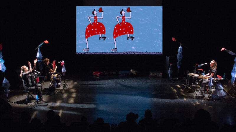 Imaginez une forêt enchantée et mystérieuse. Au fond d’une clairière, des bottes multicolores, un accordéon, des feuilles rougeoyantes, une flûte et un saxophone… Vous y êtes ? Ajoutez à cela quelques valises et un écran en toile de fond, et vous obtenez le décor étonnant de ce spectacle unique. Trois artistes talentueuses se retrouvent au milieu de cet univers féérique, jonglant entre leurs rôles de musiciennes, de comédiennes et d’exploratrices intrépides !