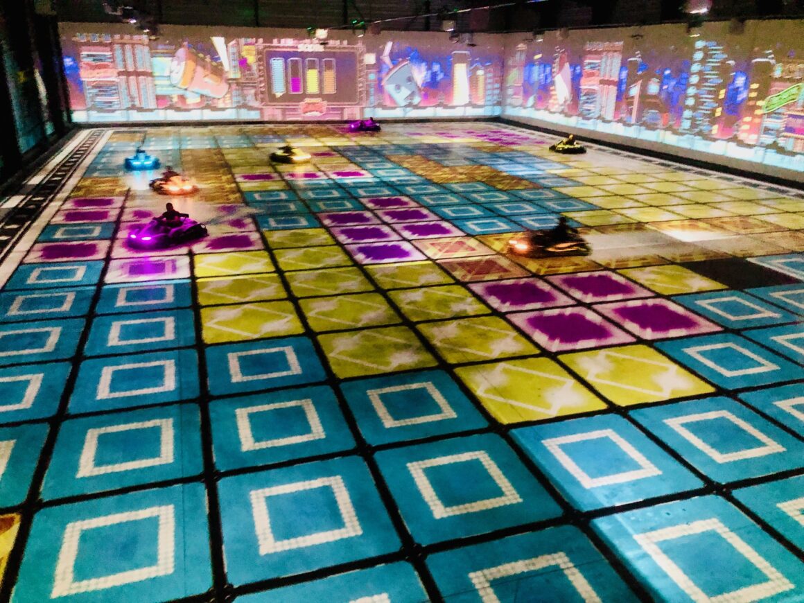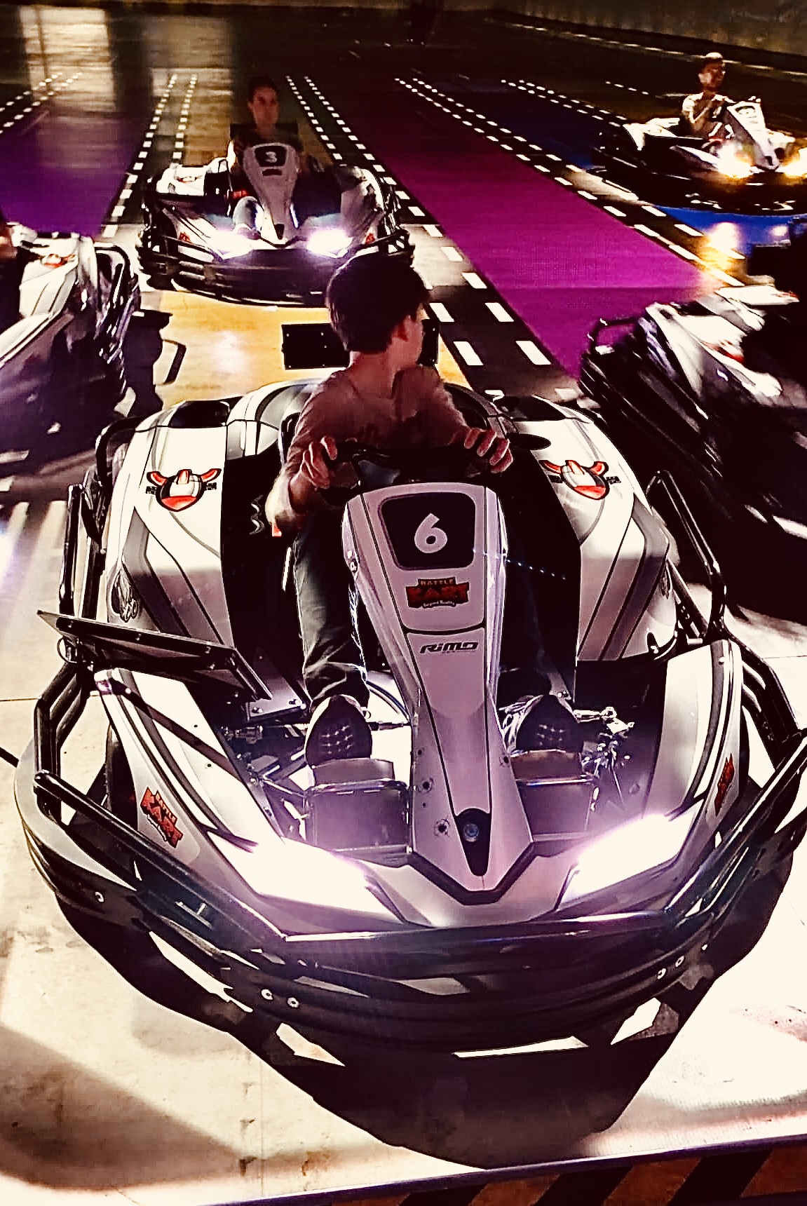 A notre arrivée sur le site couvert de BattleKart, les kids sont comme saisis par cette ambiance unique: un immense terrain de jeux s’ouvre devant eux! Il faut dire qu’on est bien loin des traditionnelles salles de karting avec leurs odeurs d’essence et leurs bruits de moteurs incessants. Ici, tout est électrique et les décibels s’en ressentent! Sur le plan visuel, ça claque fort, avec d’impressionnantes vidéo-projections au sol et aux murs. On prend des couleurs plein les yeux!