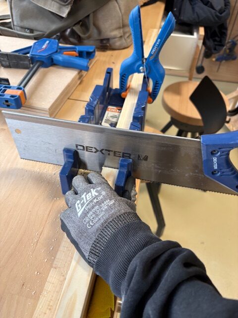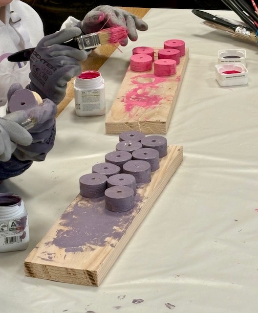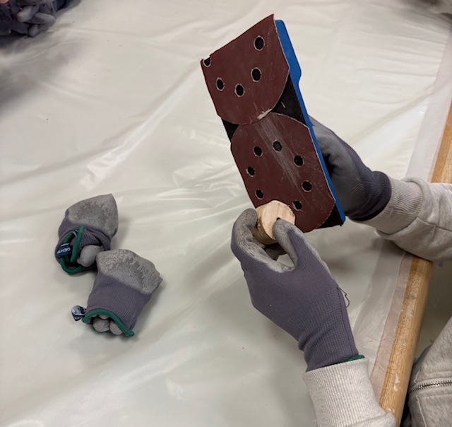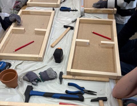 Ils enfilent les gants et commencent à se répartir les différentes taches : on s’occupe des palets, qu’il faut poncer et peindre, mais aussi de la découpe du bois pour assembler les éléments du futur jeu. On démarre l’activité dans une ambiance très tranquille, tout en douceur et en pédagogie.