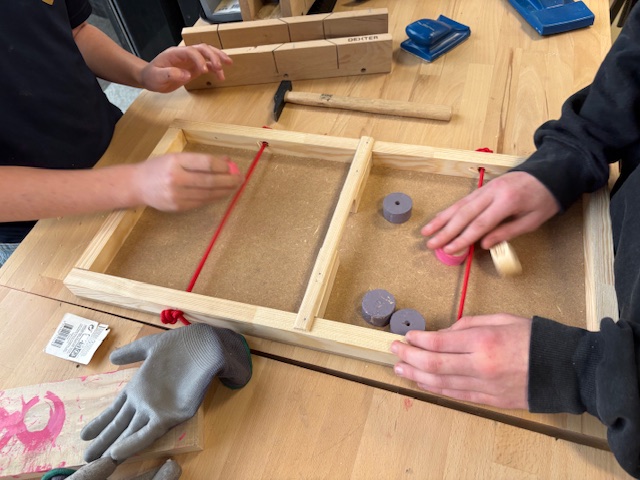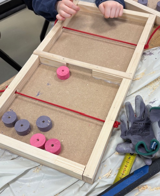 Les dernières « touches » sont mises aux objets, on y intègre les élastiques qui serviront à propulser les palets, et voici que sont présentés aux camarades de jeu les premiers plateaux, fin prêts à être testés. Les ébénistes en herbe sont fiers, chacun peut repartir avec son jeu, qui n’attendra pas le retour à la maison pour être étrenné !