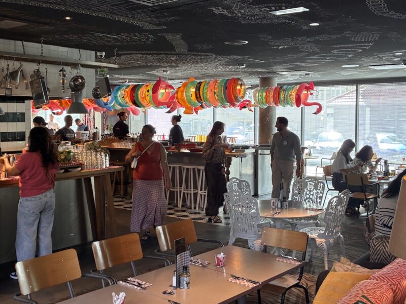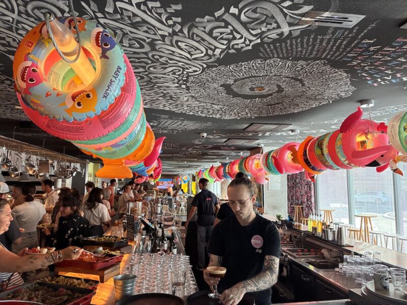 On arrive à midi pétantes (pour une fois qu’on est à l’heure…). Le cadre est canon : Philippe Starck a mis sa patte un peu partout. Au-dessus du bar pendent des guirlandes de bouées et le plafond est recouvert de dessins et petits mots écrits à la craie. Résultat : c’est cosy, chaleureux et franchement fun.