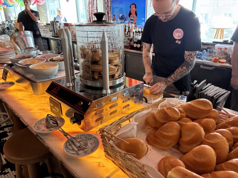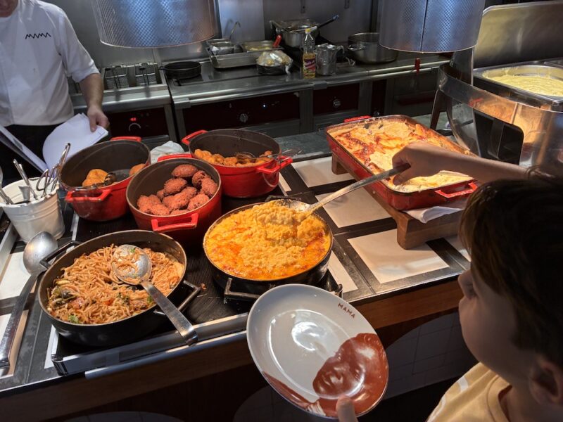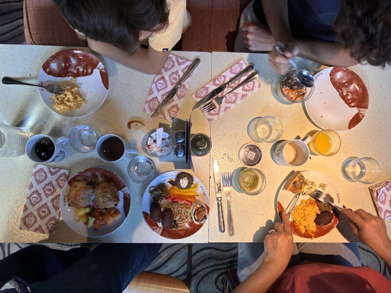 On attaque en douceur : café fumant pour les parents, chocolat chaud et jus d’orange pour les kids. Ici, les boissons sont en libre service et à volonté (et vu que de plus en plus d’établissements ne les incluent pas dans leur formule, ça fait plaisir).