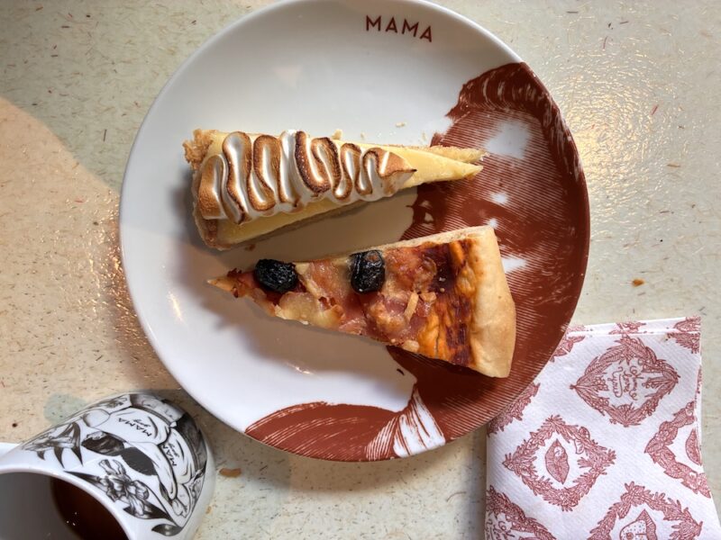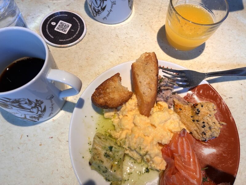 Retour au buffet pour la partie sucrée. C’est encore un festival : pains au chocolat, tarte au citron meringuée, cookies, melon, gaufres… Nos assiettes deviennent des œuvres d’art contemporaines où cohabitent une tartelette au citron et… une part de pizza (ne demandez pas, on n’a pas d’explication).
