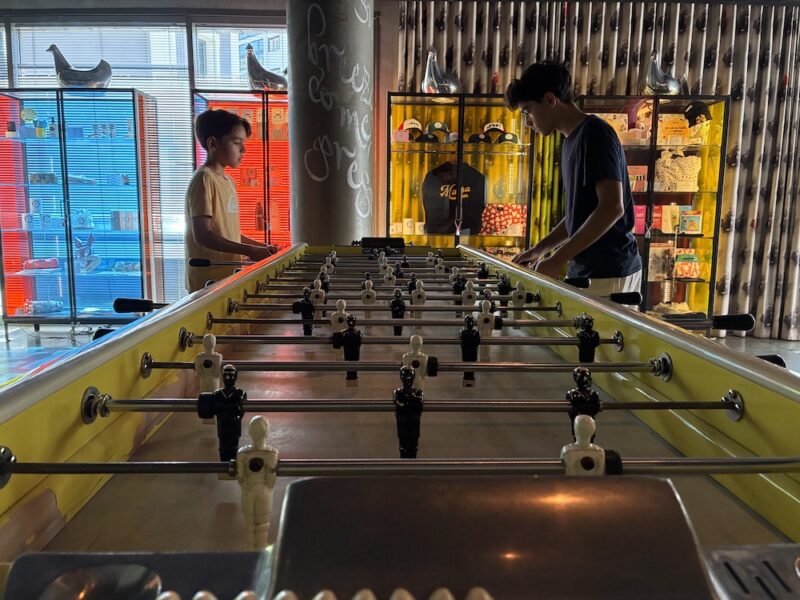 À ce stade, nos estomacs crient grâce. On décide donc de s’accorder une pause. Café numéro deux pour les parents et petite partie de baby-foot géant pour tout le monde. Match épique, suspense insoutenable, victoire des parents sur le fil (évidemment, on a triché un peu).