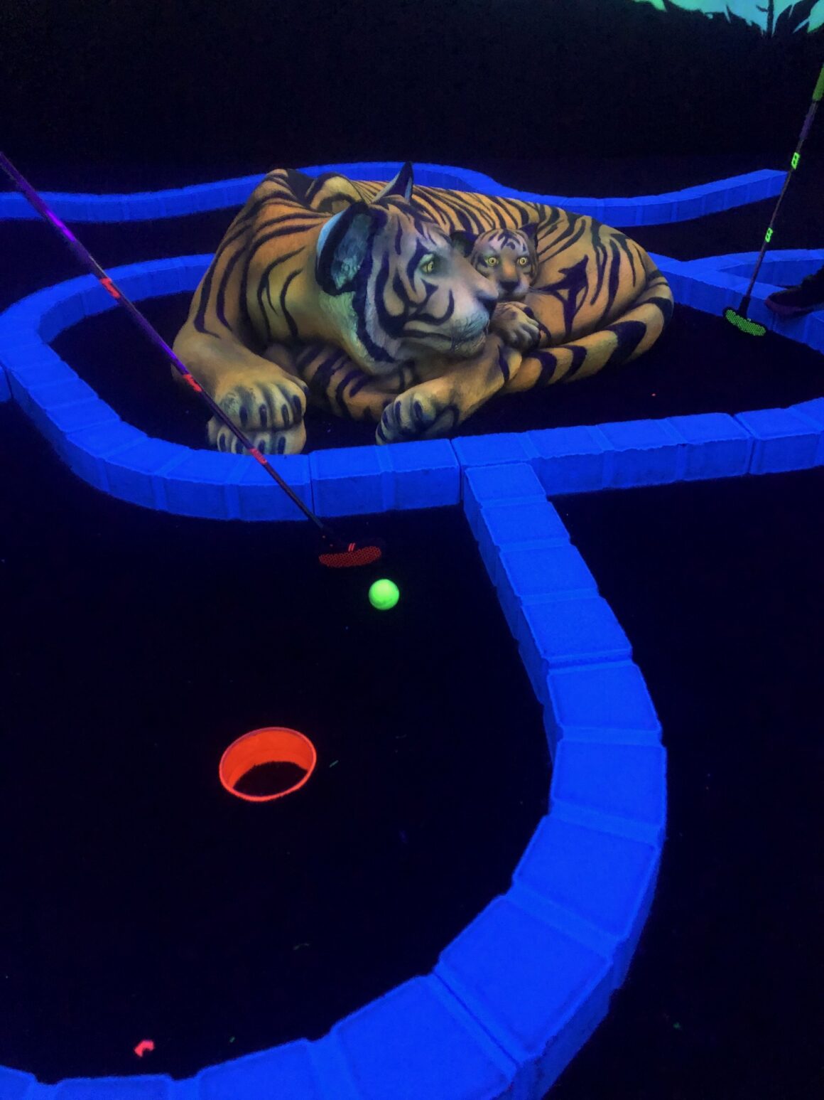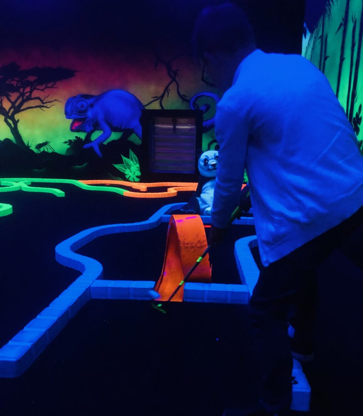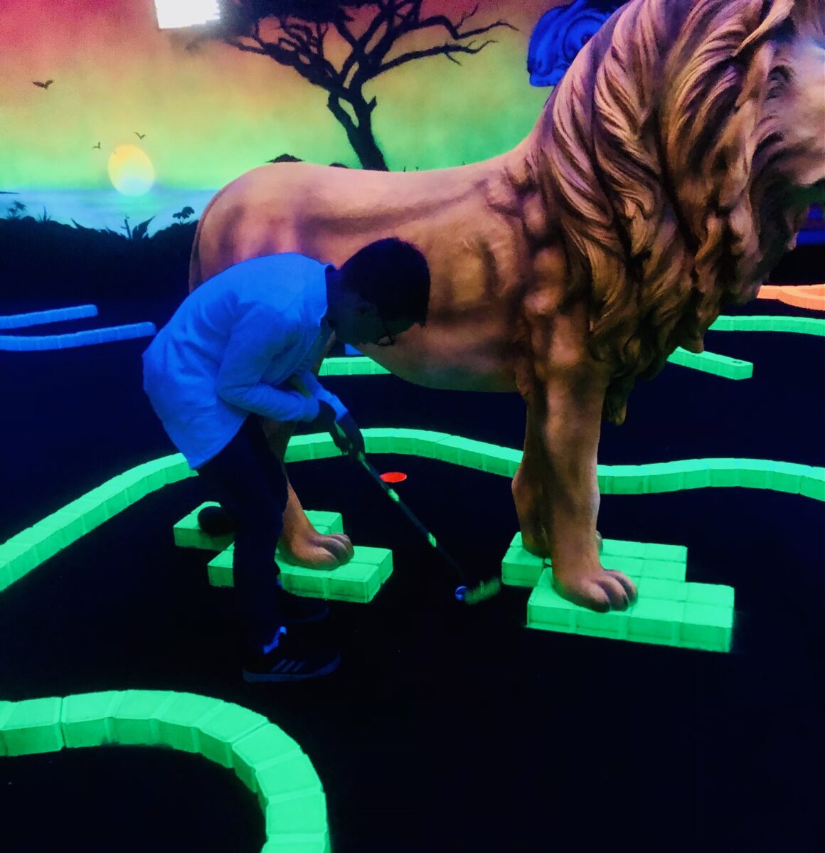 L’atmosphère est assez unique, sans être complètement flippante pour les plus petits (ils peuvent d’ailleurs venir dès l’âge de 3 ans)! Une première partie du parcours est thématisée « jungle« , et on rencontre, tout au long du parcours 18 trous, une girafe, un singe, un éléphant, etc. C’est bien fait et ça incite plutôt à être concentré sur le maniement du club de golf!