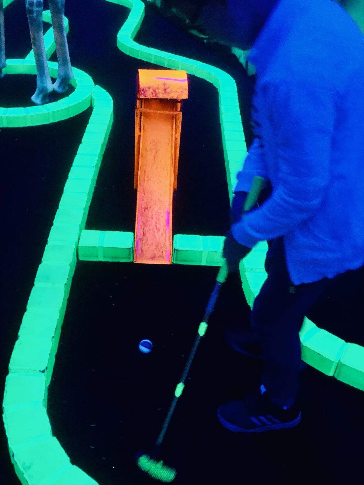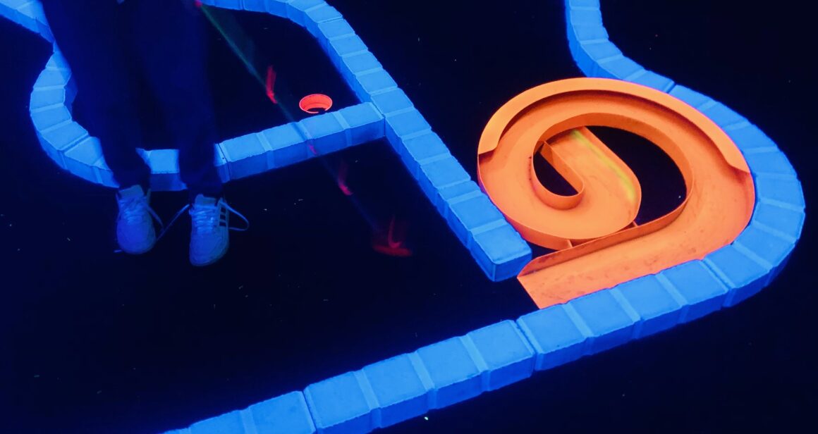 On se prépare à rentrer dans l’espace de 400 m² un peu mystérieux du minigolf, munis de notre fiche de score, de nos « putters » et de nos balles fluorescentes. Le petit effet « wahou » est inévitable, car les lieux sont assez inhabituels: l’éclairage est minimaliste mais les lumières violettes font ressortir un décor flashy sans être kitch!