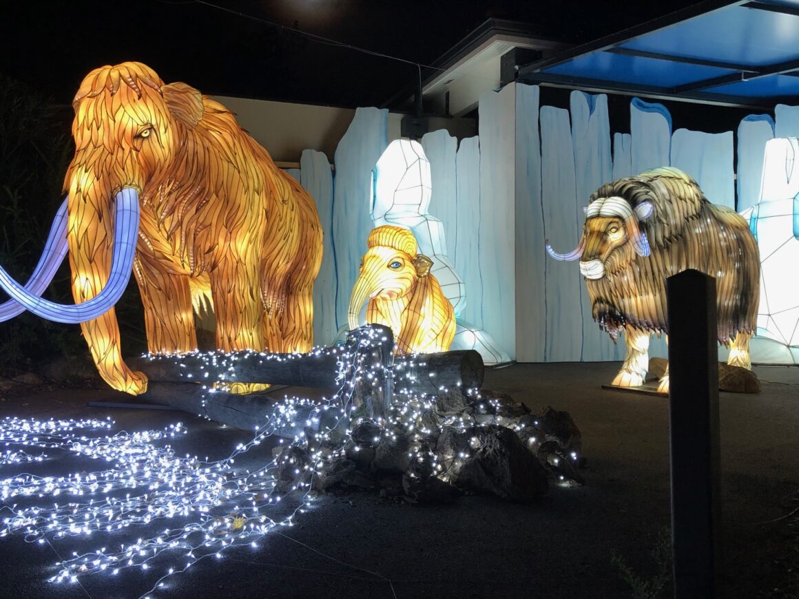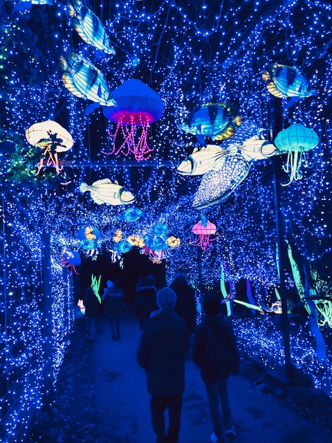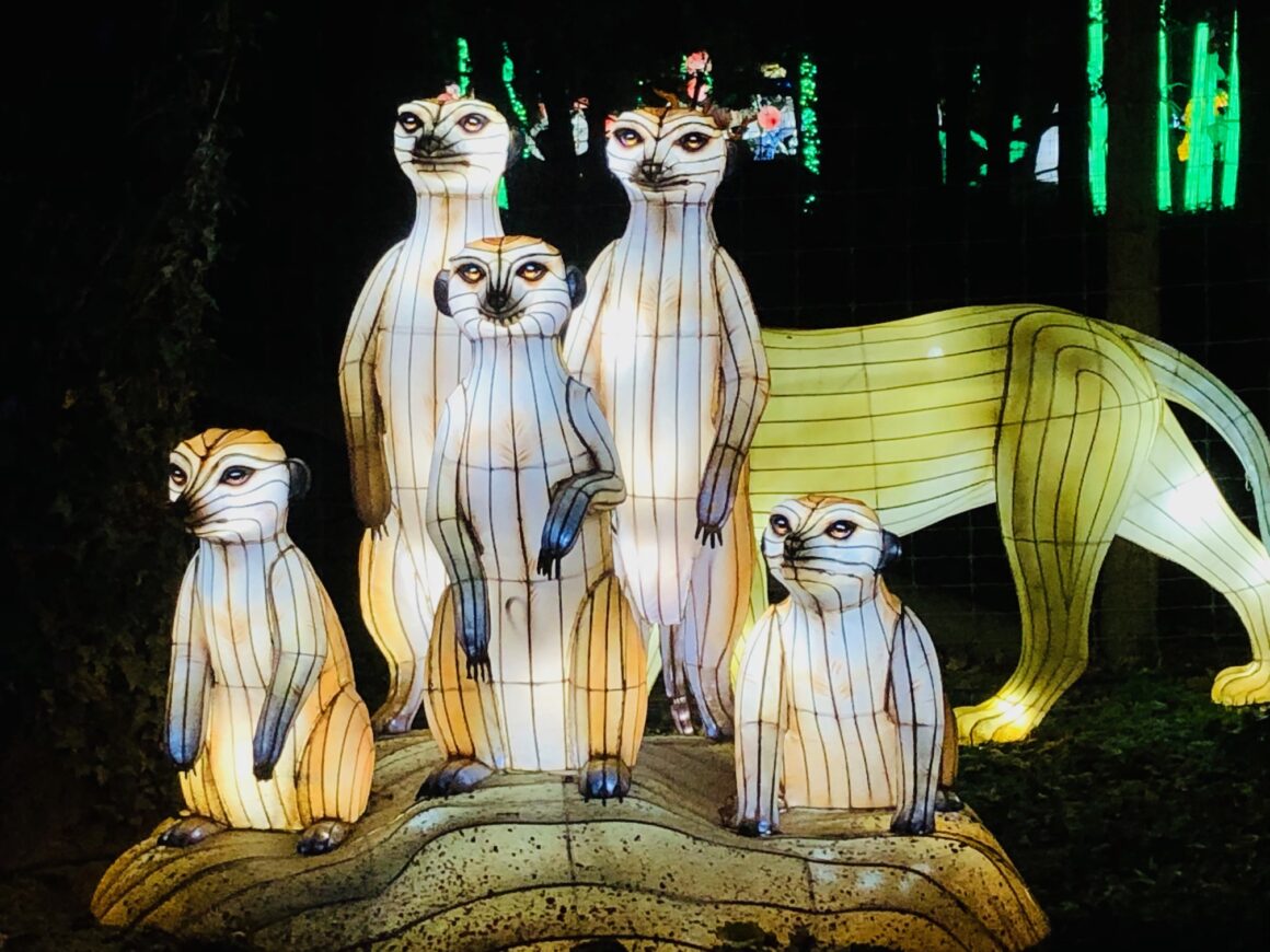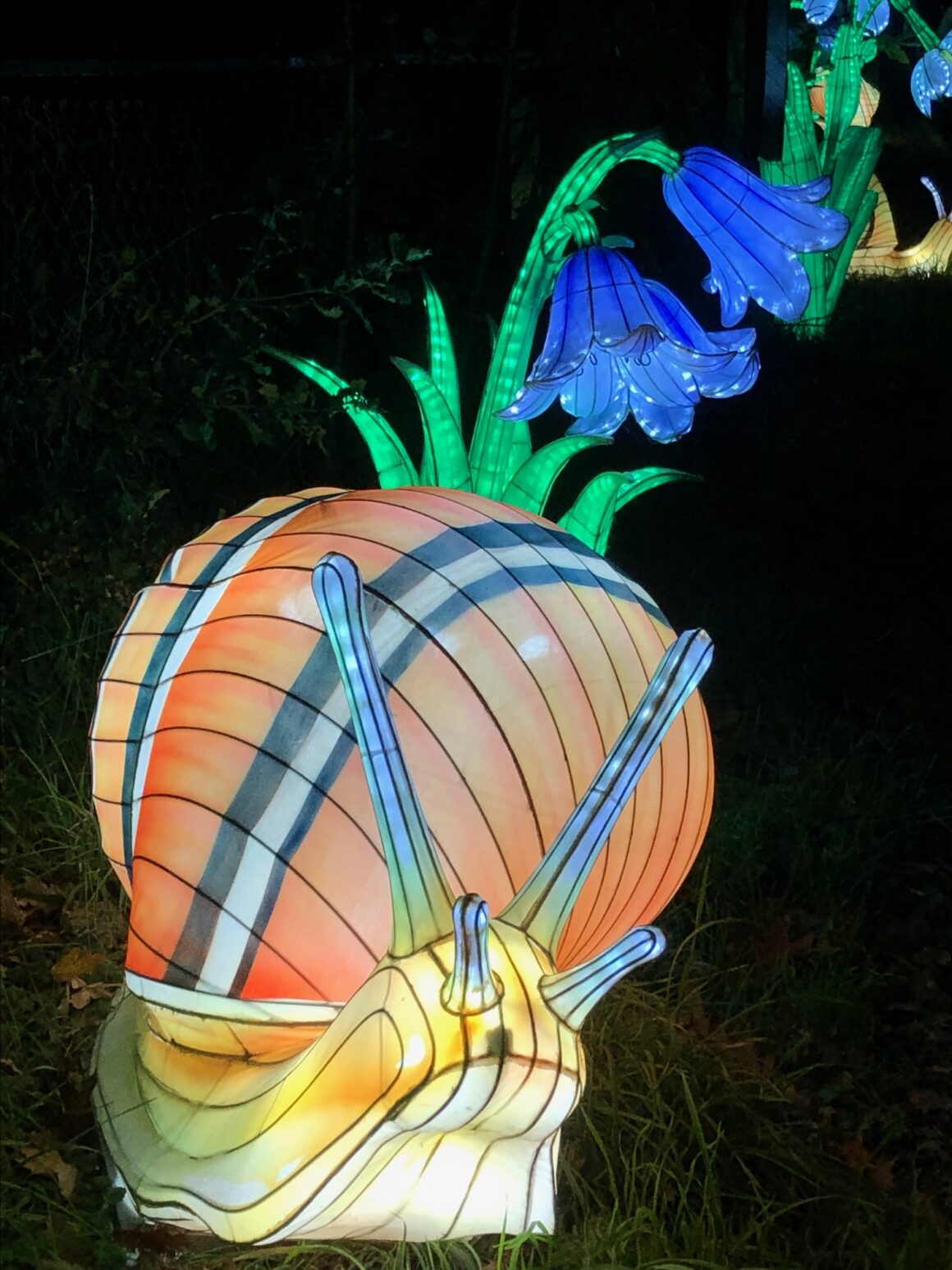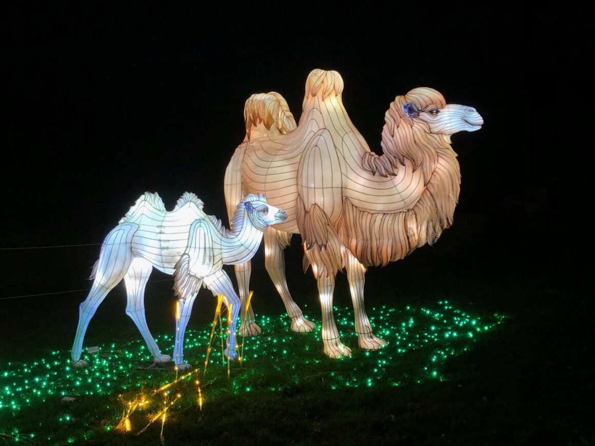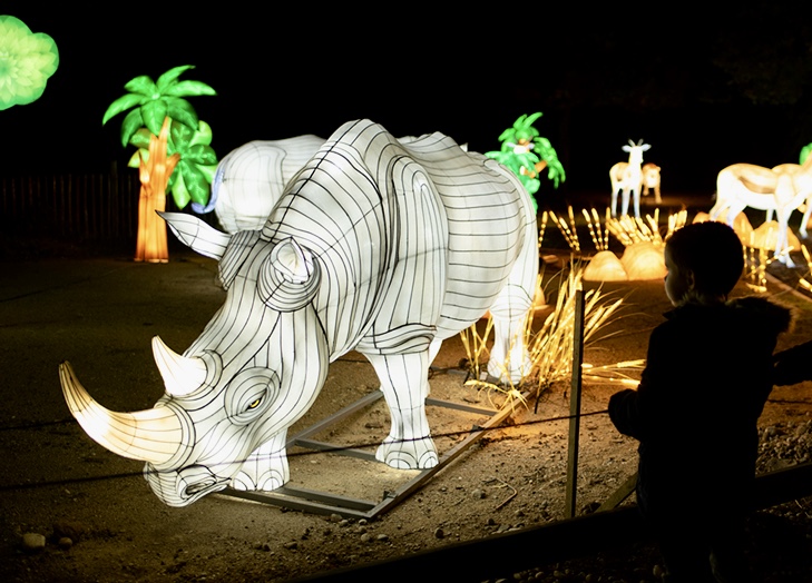 Pendant plus d’une heure, on parcourt cet univers très onirique, fait de guirlandes lumineuses et d’armatures métalliques recouvertes de feuilles de satin peintes et éclairées par des LED, dont on apprend qu’elles consomment, dans leur totalité, moins de 1% de ce que produisent les ombrières photovoltaïques des parkings ! Bravo, le safari de Peaugres! Grâce à cet énorme travail d’installation, c’est la magie des fêtes de fin d’année avant, pendant et après Noël!