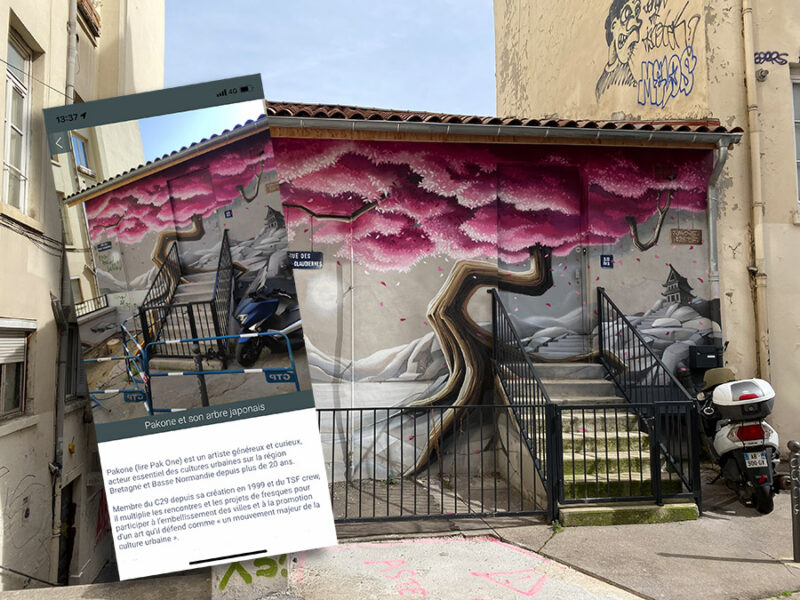 Le circuit nous fait emprunter les petites rues des Pentes. À chaque fresque ou graff remarquable, l’application nous envoie un petit bip pour attirer notre attention et nous fournir un texte d’explication sur l’œuvre et sur son auteur. Plutôt malin !