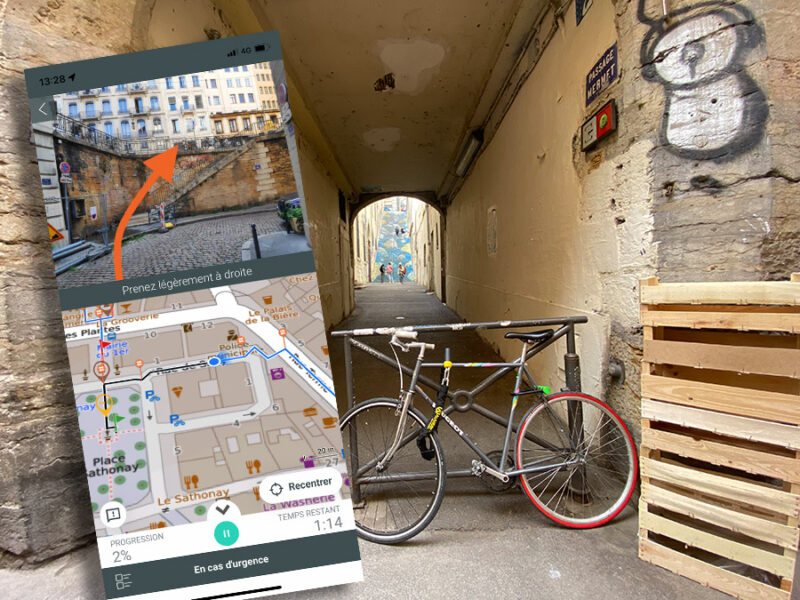 La balade démarre place Sathonay. Une fois rendu sur place, l’application me signale qu’on peut démarrer le parcours. L’écran de mon téléphone se transforme en GPS et indique quelle rue prendre et où tourner. Je confie mon précieux smartphone à l’autre prunelle de mes yeux, mon fiston, pour qu’il nous serve de guide.
