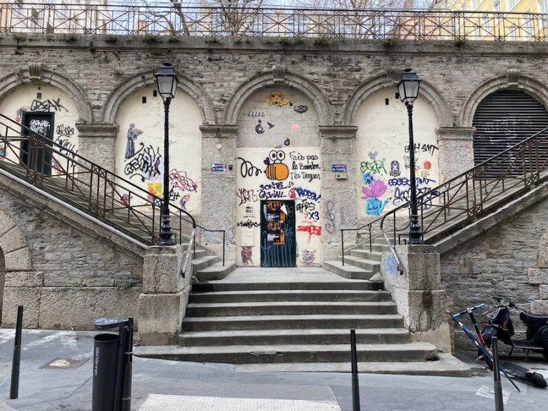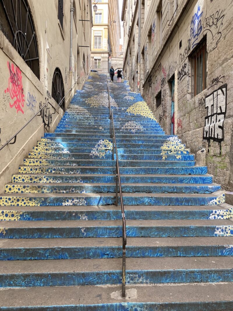 La balade nous fait emprunter le fameux escalier bleu de la rue Mermet. Nous voilà partis pour une petite session de selfies en famille sur l’un des spots les plus instagrammé de Lyon.