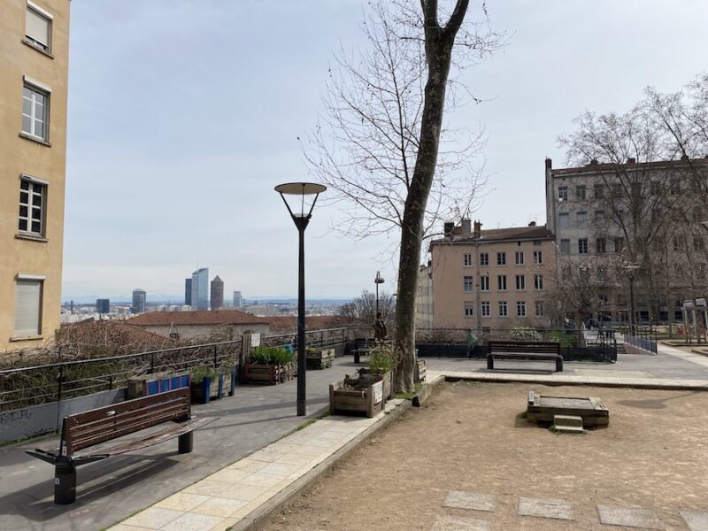 On débouche sur la place Colbert et sa fabuleuse vue sur la rive gauche de Lyon. Coup de bol, ce jour-là, le Mont Blanc nous honore de sa présence à l’horizon. Quel spectacle ! On s’accorde une petite pause grenadine sur la terrasse de l’Âne Sans Queue pour profiter encore un peu de la place et du panorama.