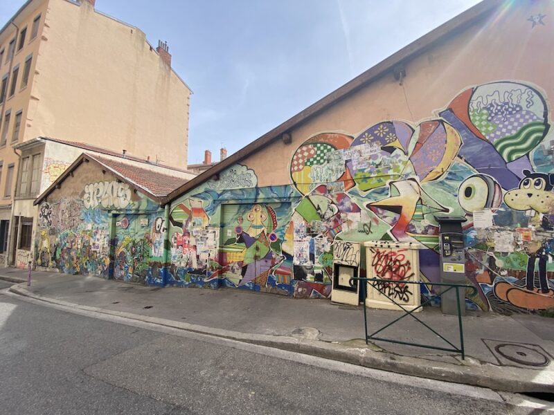 Après cette pause détente et hydratation, on repart à l’aventure. La grimpette continue jusqu’au plateau de la Croix-Rousse pour admirer l’immense fresque de la place des Tapis.