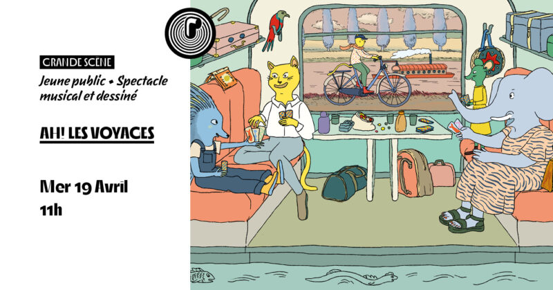 C’est une histoire de voyages. Qui se dessine et qui résonne. Tiré de l’album jeunesse éponyme, le spectacle Ah! Les Voyages nous embarque pour un tour du monde aux côtés de Pénélope, un chat humanisé et de son chat, Philéas. Attachez vos ceintures ! Rendez-vous à 11 h 00 au Périscope, comptez 6 € la place.