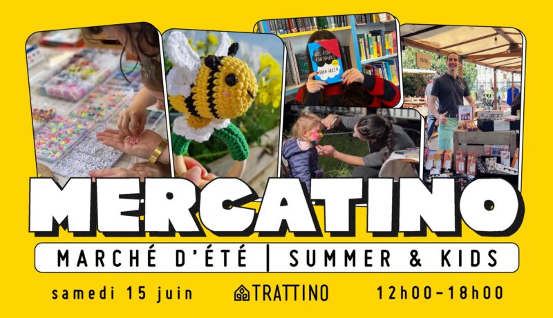 Trattino se met à l’heure d’été et des enfants. Pendant toute cette journée du samedi, bar à perles, maquillage, ateliers de crochet, librairie itinérante, atelier de cyanotype et « délicieuseries » à se mettre sous la dent, voilà le programme que vous réserve le Mercatino. Et si les kids seront en plein kiffe, les plus grands ne seront pas en reste assurément !