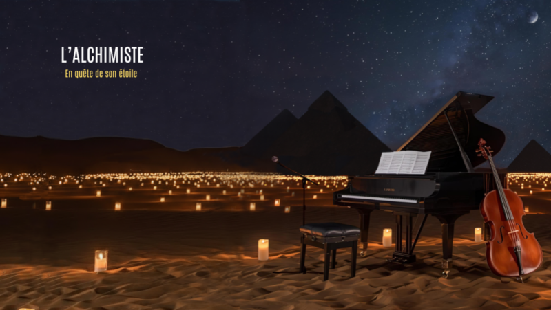 Santiago, jeune berger, quitte tout pour suivre un rêve qui le mène jusqu’aux pyramides. Sur scène, son voyage prend vie à travers une narration musicale mêlant piano, violoncelle et voix gospel qui nous transporte d’Espagne en Afrique. Le tout éclairé à la seule lueur des bougies. Côté musique, il y en a pour tous les goûts : on voyage entre le classique de Chopin, les mélodies de Sofiane Pamart et même des tubes de Whitney Houston ou Hans Zimmer.